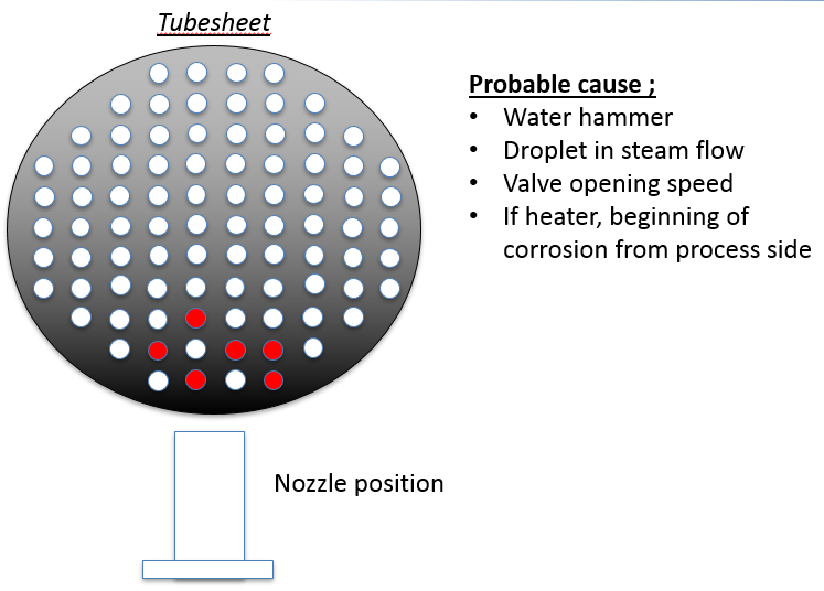 例如 (管板截面紅色部分的管子泄露),問題集中在管殼噴嘴附近位置,揭示了可能的故障原因。