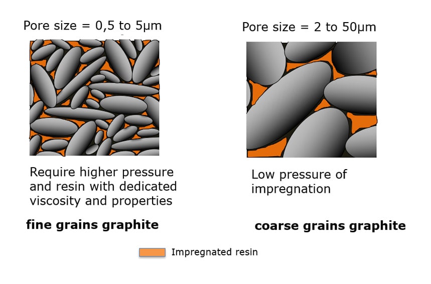 浸漬過程包括用另一種材料填充石墨內(nèi)部孔隙(根據(jù)等級在5 – 20%之間)。 通常液體樹脂在壓力和時間的作用下被迫滲透到孔隙中。 下文比較了兩種浸漬方法下的石墨結(jié)構(gòu)。